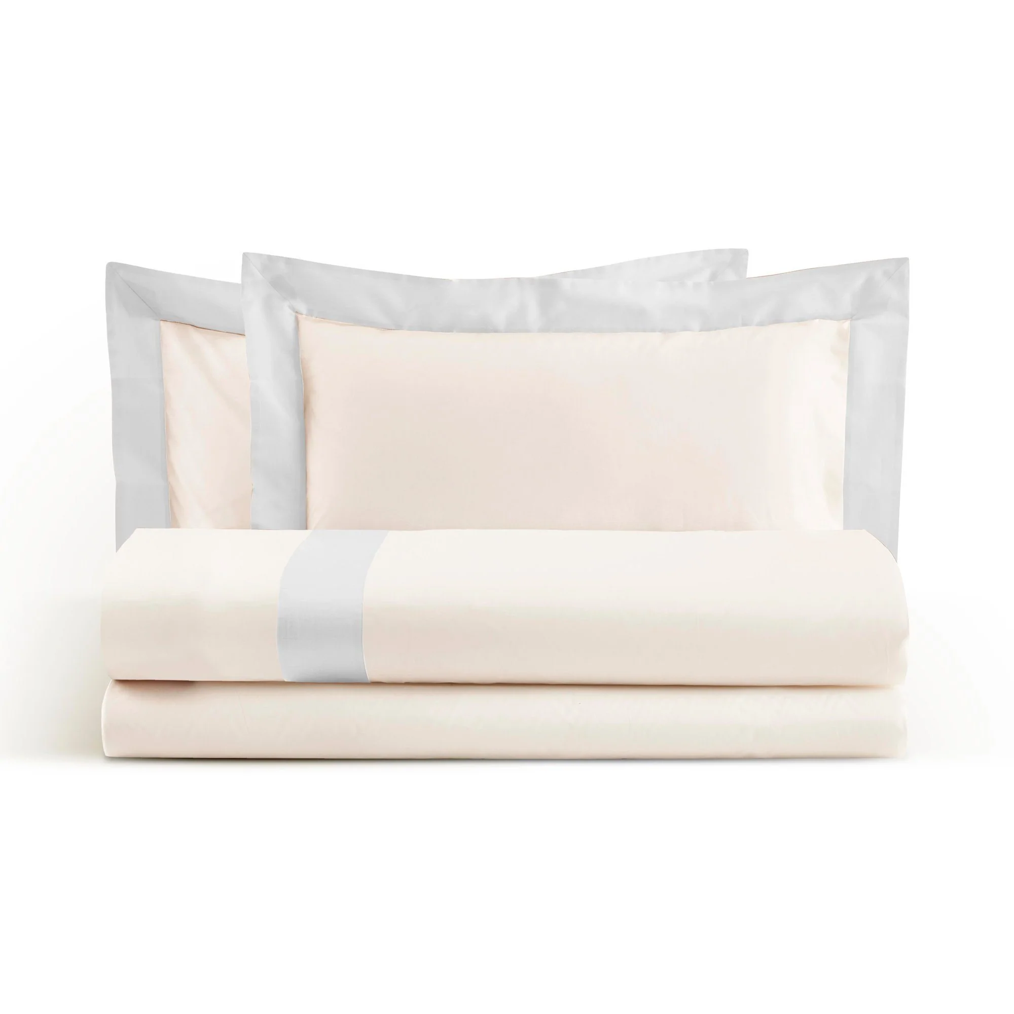 Il Completo Copripiumino Diamante è realizzato in puro cotone 300 TC (120 fili). Morbido e confortevole, è arricchito da una delicata balza a contrasto in raso di cotone e federe bordate sui tre lati.